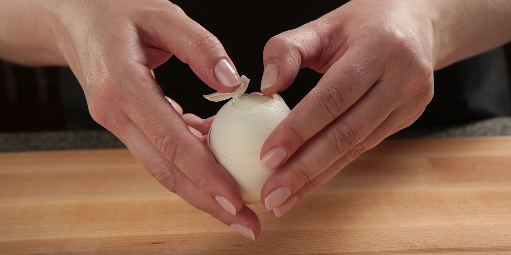 - To peel a hard boiled egg, crackle the shell all over by tapping the egg on a hard surface, then roll the egg between your hands to loosen the shell. Begin peeling at the large end. Hold the egg under cold running water or dip it in a bowl of water to help remove the shell.