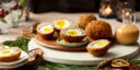 Take a portion of the chilled stuffing in one hand (about ⅛ of the mixture) and flatten it slightly in your palm. Place an egg in the center of the flattened stuffing and gently close the stuffing around the egg to completely coat. Repeat for all 8 eggs and set aside.